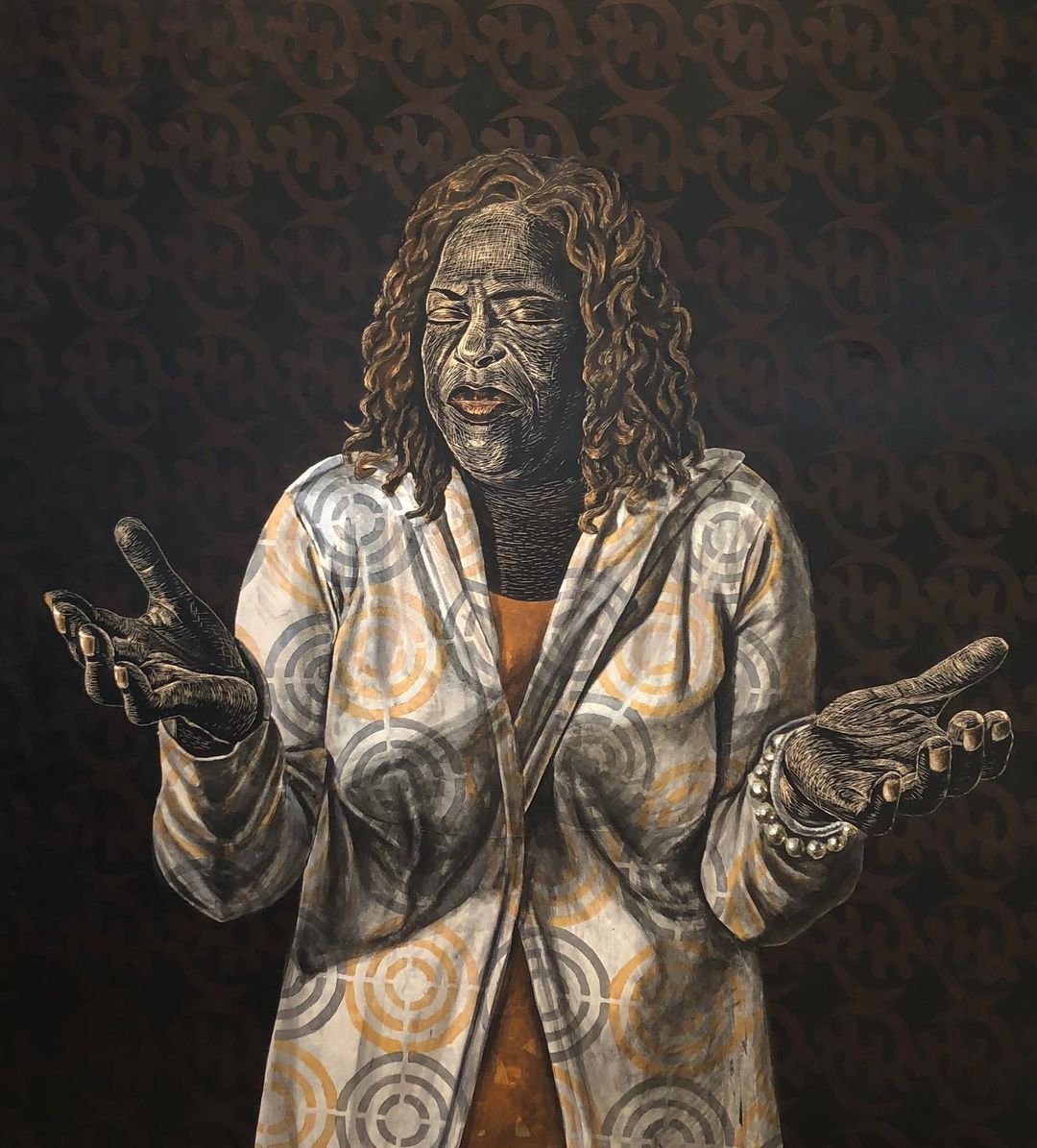 Okay, so... Latoya Hobbs is a woodcut/mixed media artist, but I am so inspired by her work as a linocut artist that I thought it fair to include her! Latoya's final artwork is often not the impression, but the actual wood-block. In the image above, you can see the fine hatching marks used to render skin tone are carved, and the rest of the image is painted or stamped. She also uses pattern to excellent effect. Relief printmaking techniques don't always have to result in a signed edition of identical prints! Let's push the boundaries a little!