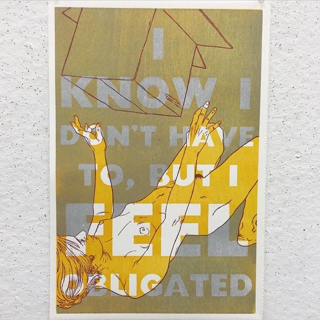 Christa Carleton is another woodcut artist, but I'm including her because I believe that her work would be equally effective if it were rendered in lino. Also, it's excellent. If you're a letterpress-lino printer like myself, you might look at this and think, aha! I could use type to mimic this effect! But if you look closer, you'll notice that the letters have all been carefully carved out of the background. Very neatly. Christa effectively combines text and image, certainly, but I think it's also important to note that her text is clever, even poetic, and her renderings of women are sensitive and honest. Bravo.